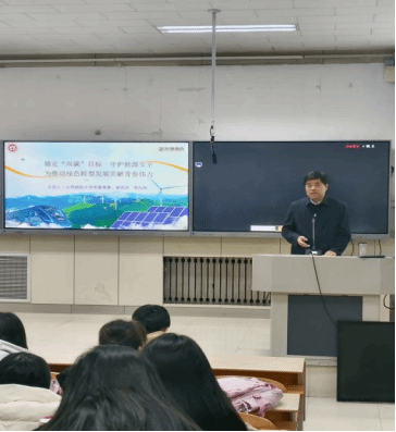 李向阳以严密的逻辑、循循善诱地给学生们讲述了四个方面的内容,即“能源安全新战略”引领十年巨变,“推动绿色转型发展”势在必行,“大力发展新能源”实现破局,奋进担当书写青春绚丽篇章。