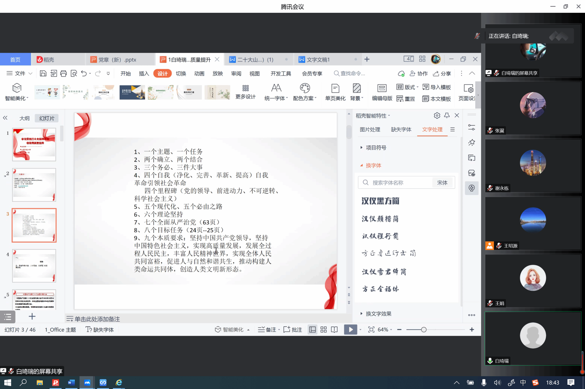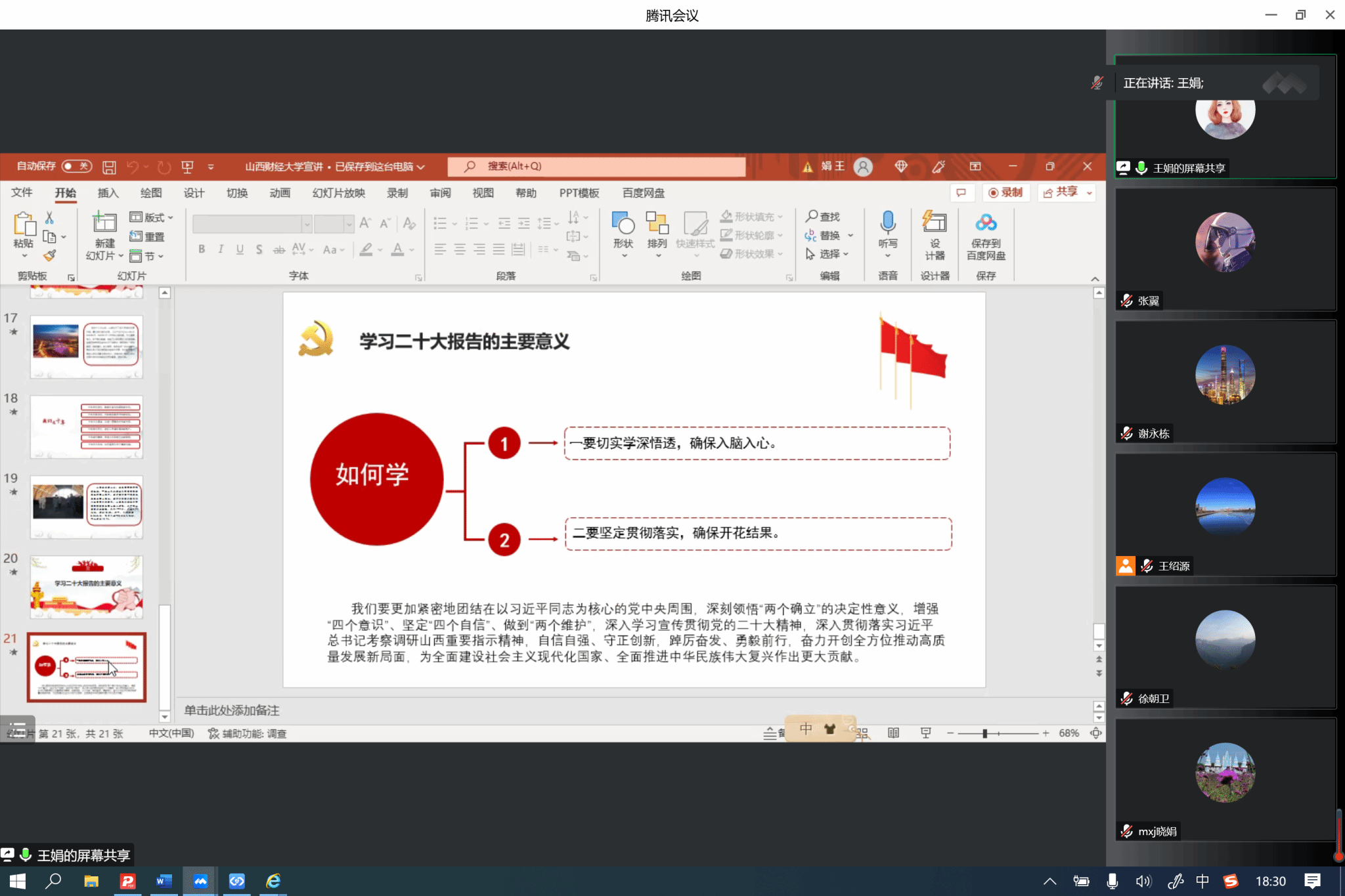在集体备课会上,围绕学习宣传贯彻党的二十大精神这一主题主线,必威西汉姆联王娟老师、白琦瑞老师分别就开展党的二十大精神宣讲的核心理念、内容要点、手段依循、方法依托等方面进行了导学。在此基础上,与会成员集中围绕学习阐释党的二十大精神这一主题,在宣讲内容、宣讲形式、宣讲方法等方面达成了思想共识,为接下来宣讲活动的开展奠定了坚实基础。
