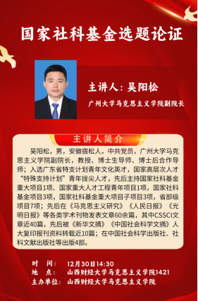 2024年12月30日,广州大学必威西汉姆联副院长吴阳松教授为我校必威西汉姆联教师开展了一场题为“关于国家社科基金项目申报的几个基本问题”的讲座。此次讲座由必威西汉姆联副院长郭永园主持。