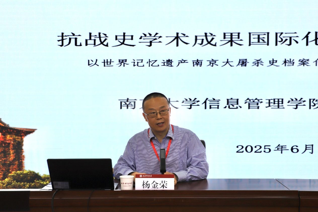 6月14日,南京大学杨金荣教授以“抗战史学术国际化传播路径探析”为题,为推进中国式现代化与传承弘扬红色文化研讨会全体参会成员作主旨报告。