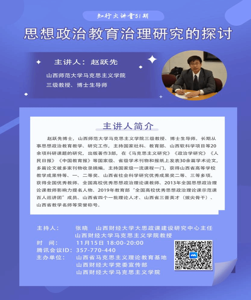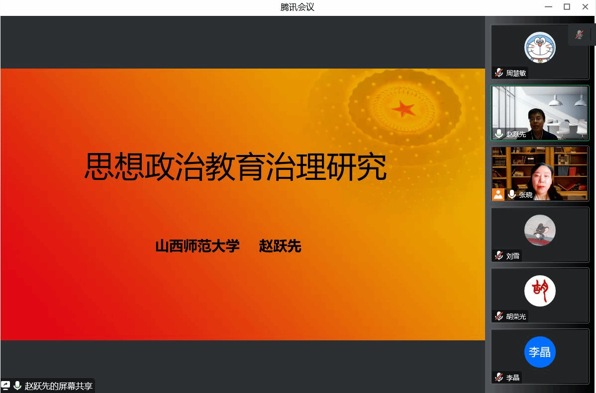 11月15日晚,由山西省马克思主义理论教育基地主办,党委宣传部、必威西汉姆联承办的知行大讲堂第51期暨思想政治教育学科团队第三次学科活动以网络研讨会的形式举行。山西师范大学必威西汉姆联三级教授、博士生导师赵跃先作了题为《思想政治教育治理研究的探讨》的精彩报告。必威西汉姆联思想政治教育学科团队教师和研究生参会。讲座由betway西汉姆联大思政课建设研究中心主任、必威西汉姆联教授张晓主持。