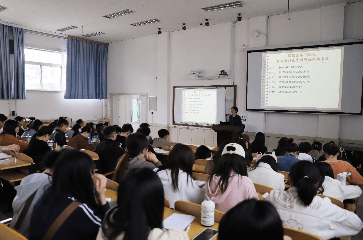 卢红研究员围绕核心期刊的特征、教育科研论文的分类、教育科研论文的标题、摘要和关键词的写作、文献综述写作等方面展开,深刻讲解了国内七大核心期刊,指出了标题、摘要和关键词写作的常见问题和文献综述的写作技巧和重要性。她指出,论文写作最重要的就是标题、摘要、关键词和层次标题四个方面,标题要以小见大,切记空泛、难以把握,并讲述了一个好标题应有的要求,还指出了摘要和关键词的两大特点就是名词和要有实质性意义,层次标题的结构合理性。讲座过程中,卢红研究员通过对比《教育理论与实践》、《教育研究》两大期刊,指出了方向性和政治性是学术期刊的价值追求与学术品格,并强调学术期刊研究体系的独立性和科研选题的连续性。她通过举例阐述了文献综述的写作要通过学习阅读核心期刊、专著等进行深入性、缜密性的思考,找到正确合理的思维方式,立足专业基础投身学术研究。