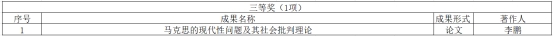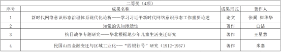 其中,张翼老师的论文《新时代网络意识形态治理体系现代化论析——学习习近平新时代网络意识形态工作重要论述 》、白洁副教授的著作《知觉的认知渗透性》、王星慧副教授的著作《抗日战争专题研究——华北根据地少年儿童生活变迁研究》以及米嘉老师的著作《民国山西金融变迁与区域工业化-—“四银行号”研究(1912-1937)》 分别荣获二等奖。李鹏教授的论文《马克思的现代性问题及其社会批判理论》荣获三等奖。