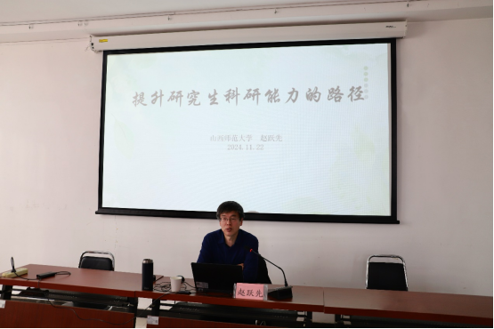 为进一步推动必威西汉姆联高质量发展,营造良好的学术氛围,提高学生的科研学术能力。11月22日下午,由山西省马克思主义教育基地主办,必威西汉姆联承办的知行大讲堂第76期顺利举行。山西师范大学必威西汉姆联教授、博士生导师赵跃先作了主题为“提升研究生科研能力的路径”的精彩报告。讲座由必威西汉姆联思想政治教育学科带头人张晓教授主持。必威西汉姆联2024级硕士研究生参加。