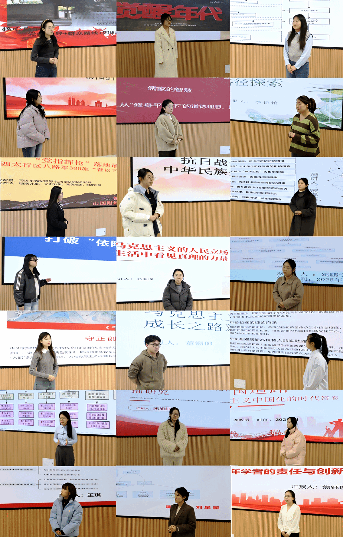 比赛中,同学们以马克思主义经典著作为理论遵循,紧扣当代中国发展实践,力求拓展学术视野、挖掘多元研究视角,深化对现实问题的思考与阐释。演讲主题涵盖中华优秀传统文化传承与创新发展、科技赋能红色文化传承弘扬、伟大抗战精神的时代价值、高校思政课改革创新、数智时代青年主流意识形态认同、铸牢中华民族共同体意识等领域,内容各有侧重、各具亮点,兼具理论深度与现实意义。同学们表达从容得体,仪态大方自信,以饱满的热情、清晰的思路阐述观点,既展现了扎实的专业功底,又传递出青年学子对学术研究的热忱以及对时代使命的自觉担当。