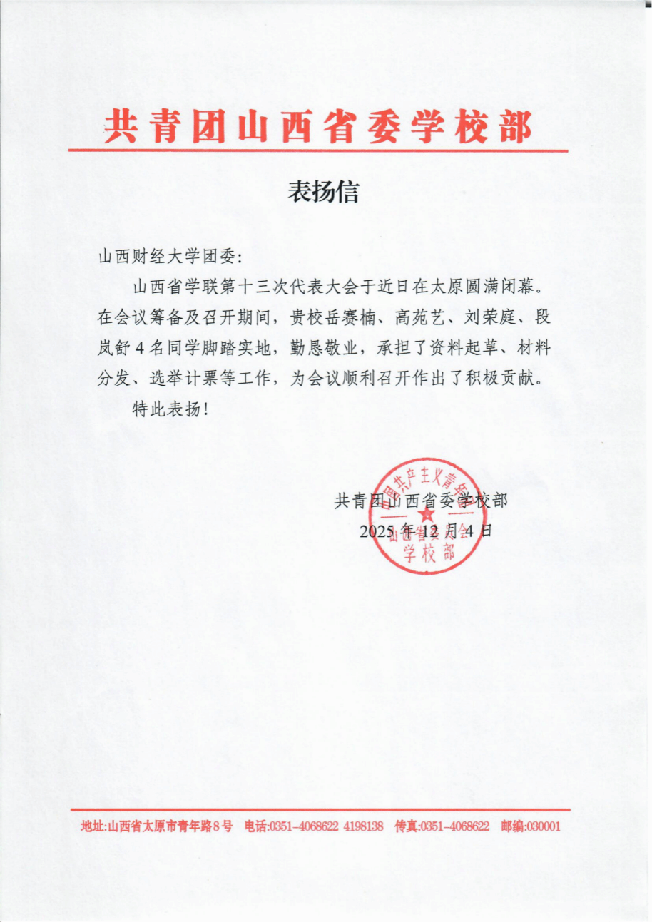 12月4日,共青团山西省委学校部向betway西汉姆联团委发来表扬信,对我院岳赛楠、高苑艺、刘荣庭三名同学在山西省学生联合会第十三次代表大会筹备及召开期间的突出表现予以表扬。我院学生在大会资料起草、材料分发、选举计票等关键环节中承担重要任务,以严谨态度和扎实作风完成各项工作,获团省委充分肯定。