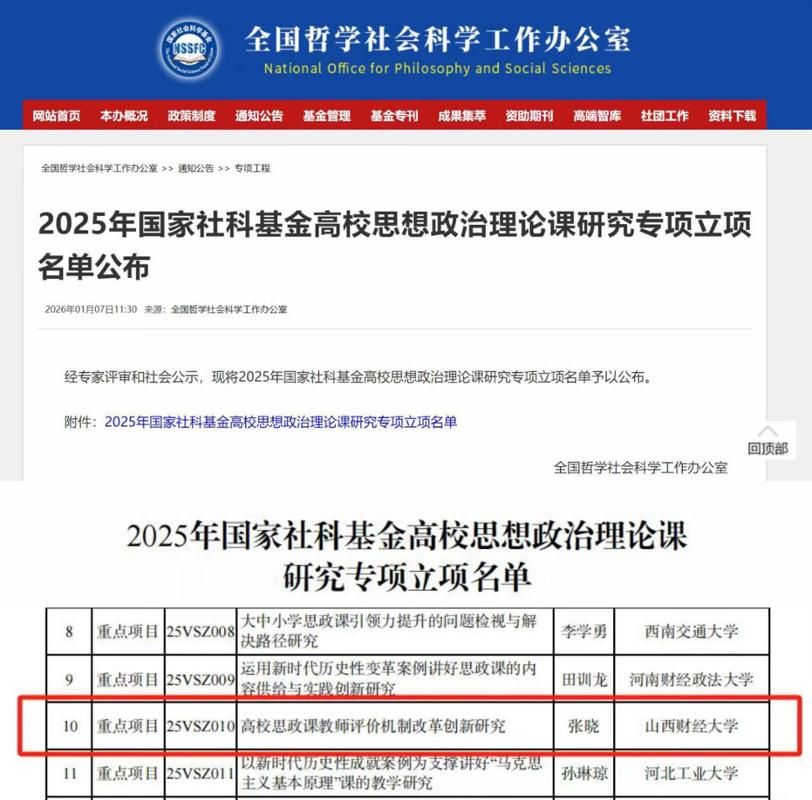 近日,全国哲学社会科学工作办公室公布了国家社科基金高校思想政治理论课研究专项立项名单,共立项185项,其中重点项目27项。我校必威西汉姆联张晓教授获批重点项目“高校思政课教师评价机制改革创新研究(批准号:25VSZ010),该项目既是山西省高校唯一的1项重点项目,也是我校国家社科基金高校思想政治理论课研究专项重点项目零的突破。