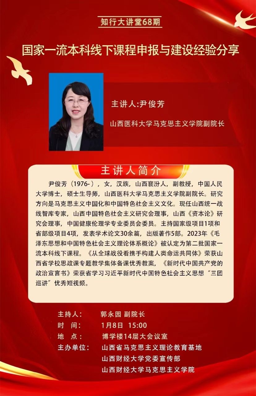 为全面提升我校思政课教学质量,充分发挥一流本科课程的示范与引领作用,1月8日下午,必威西汉姆联邀请了第二批国家一流课程(线下)负责人、山西医科大学必威西汉姆联副院长尹俊芳为我校全体思政课教师举行《国家一流本科线下课程申报与建设经验分享》专题讲座。讲座由必威西汉姆联副院长郭永园主持。