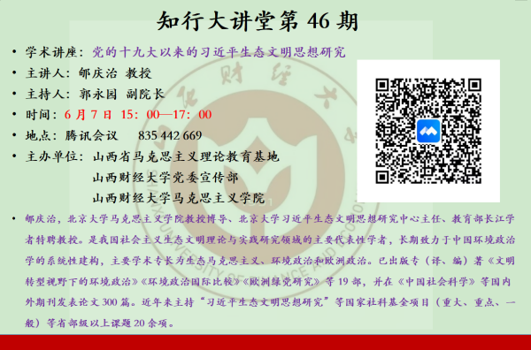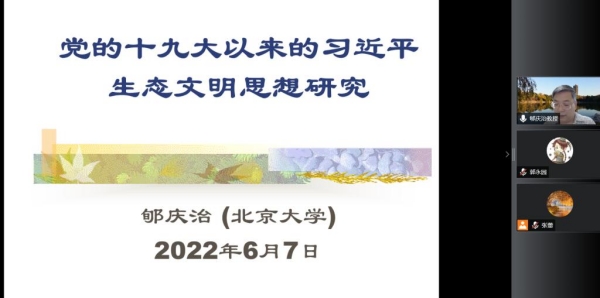 在第51个世界环境日以及第8个中国“环境日”来临之际,由山西省马克思主义理论教育基地主办,betway西汉姆联党委宣传部、必威西汉姆联承办的知行大讲堂第46期于6月7日下午以网络研讨会的形式顺利举行。教育部长江学者特聘教授、北京大学必威西汉姆联教授、习近平生态文明思想研究中心主任郇庆治教授作了题为《党的十九大以来的习近平生态文明思想研究》的精彩报告。必威西汉姆联师生、思政工作骨干以及兄弟院校师生200余人通过腾讯网络研讨会参加此次学术讲座。讲座由必威西汉姆联副院长郭永园主持。